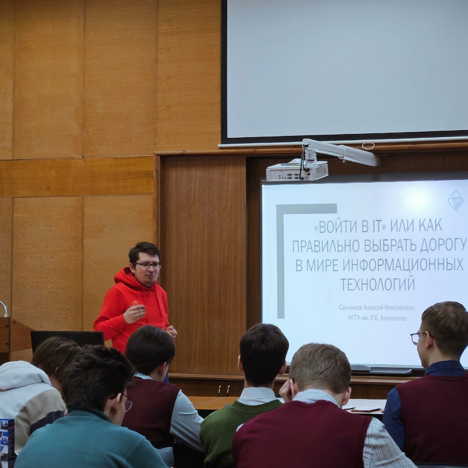 После экскурсии состоялась встреча с ассистентом кафедры “Информатики и систем управления” Алексеем Санниковым на лекции “Войти в IT или как правильно выбрать дорогу в мире информационных технологий”. В ходе активного диалога ребята узнали о преимуществах обучения на направлениях, связанных с IT областью, научных проектах НГТУ и как устроен механизм нейронных сетей.